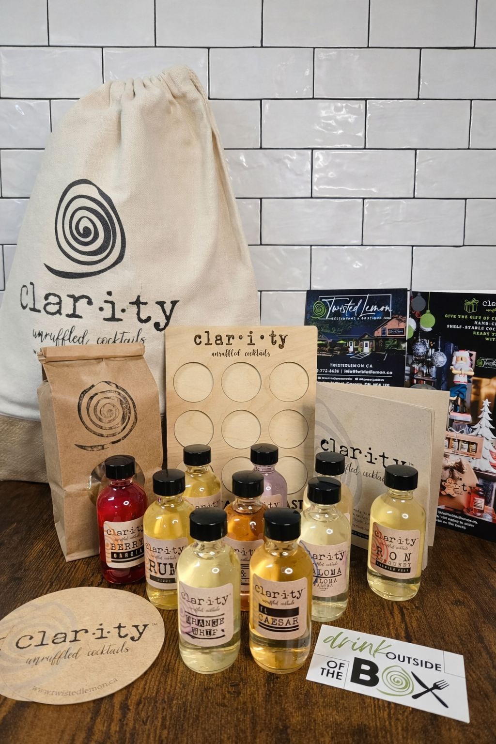 The Clarity Cocktail line is committed to having the smallest environmental footprint possible by using environmentally conscious products and packaging with no straws, picks or plastic bags! With as close to zero ingredient waste as possible, cocktail bi-products are creatively used in the Twisted Lemon kitchen to make flavour-full ice creams, cheesecakes, savouries and so much more!